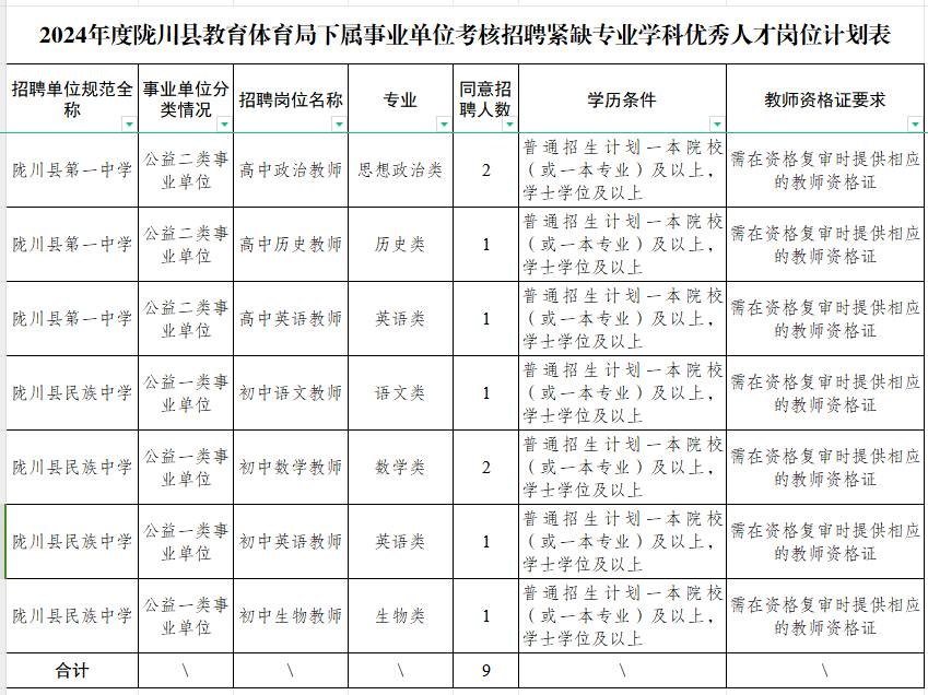 根據(jù)《關(guān)于同意縣教育體育局黨組使用編制通知單》(隴機(jī)編辦準(zhǔn)[2023]4號(hào))及《隴川縣人力資源和社會(huì)保障局關(guān)于印發(fā)2024年教育衛(wèi)生部門考核招聘緊缺專業(yè)學(xué)科優(yōu)秀人才工作方案的通知》隴人社發(fā)〔2024〕2號(hào)文件精神,2024年隴川縣教體系統(tǒng)考核招聘緊缺專業(yè)學(xué)科優(yōu)秀人才9名,其中:隴川縣第一中學(xué)4名、隴川縣民族中學(xué)5名,F(xiàn)將有關(guān)事宜公告如下: