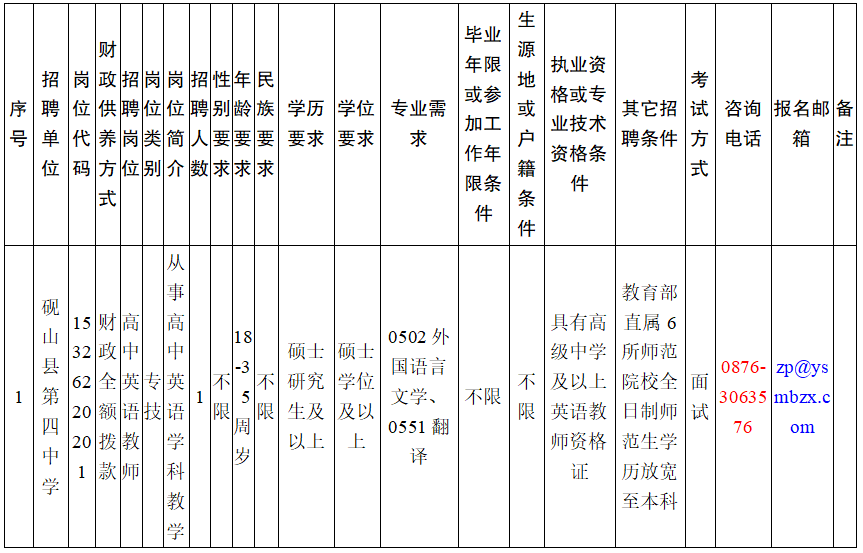 本次緊缺崗位招聘采取網(wǎng)絡(luò)報(bào)名或現(xiàn)場(chǎng)報(bào)名的方式進(jìn)行。網(wǎng)絡(luò)報(bào)名郵箱為:zp@ysmbzx.com,咨詢電話:0876-3063576。現(xiàn)場(chǎng)報(bào)名可到硯山縣第四中學(xué)進(jìn)行報(bào)名。