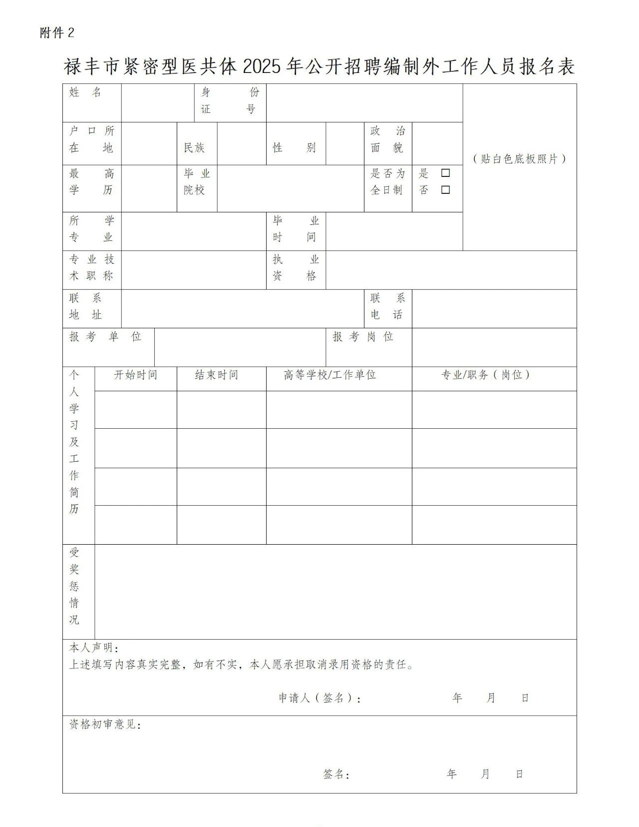 (1)《祿豐市緊密型醫(yī)共體編外人員招聘報(bào)名表》(附件2),粘貼近期免冠小1寸白底證件照;