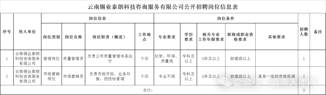 1.《云南錫業(yè)泰朗科技咨詢服務有限公司公開招聘崗位信息表》