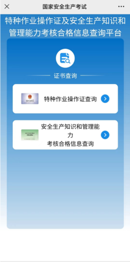 方式二:微信搜索并關(guān)注官方微信公眾號“國家安全生產(chǎn)考試”,點擊證書查詢→輸入查詢,查詢證書信息及復審時間。