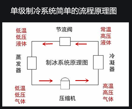 蒸汽壓縮式的冷庫制冷系統(tǒng)的流程原理,仍是大家熟悉的四大過程,即:壓縮——冷凝——節(jié)流——蒸發(fā)。相應(yīng)的配套的主要設(shè)備是制冷壓縮機,冷凝器(風(fēng)冷式或水冷式),節(jié)流閥(氟制冷系統(tǒng)為熱力膨脹閥),蒸發(fā)器(冷庫常用的為直冷排管和風(fēng)冷式風(fēng)機)。